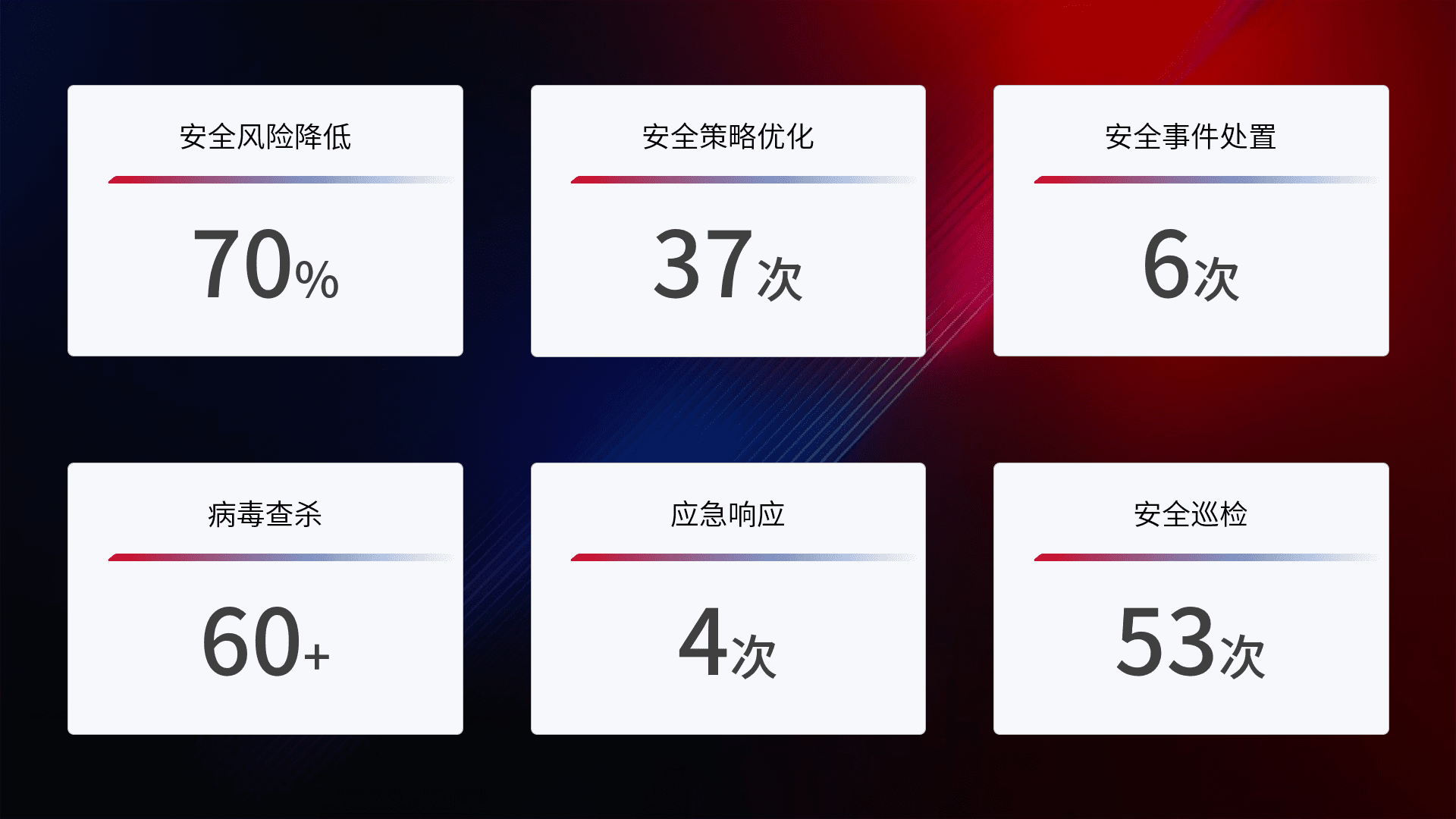 提供全面的安全事件报告体系,,,,包括处置报告、、周报、、、季度和年度总结,,,,结合持续监控,,帮助客户深入了解网络安全状况。。