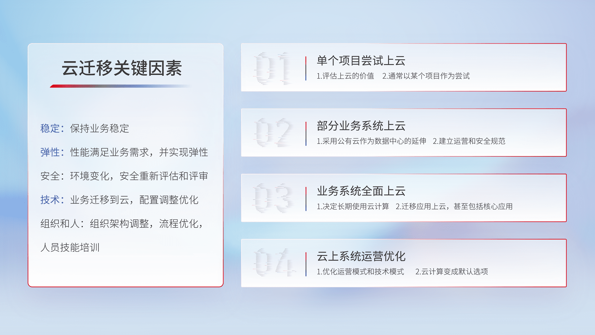 结合实际业务,,,从规划设计、、、、云平台选型、、云原生改造、、、数据迁移、、集成交付,,,,迁移全过程为客户识别最佳上云路径,,,,做好风险识别管理,,,设计网络架构、、身份权限、、、安全审计合规、、、操作审计、、日志审计、、监控告警策略、、、、多站点容灾设计等,,,,对云上基础设施进行整体规划,,,,提升IT治理水平,,以满足弹性、、、高可用、、、、高性能的需求。。