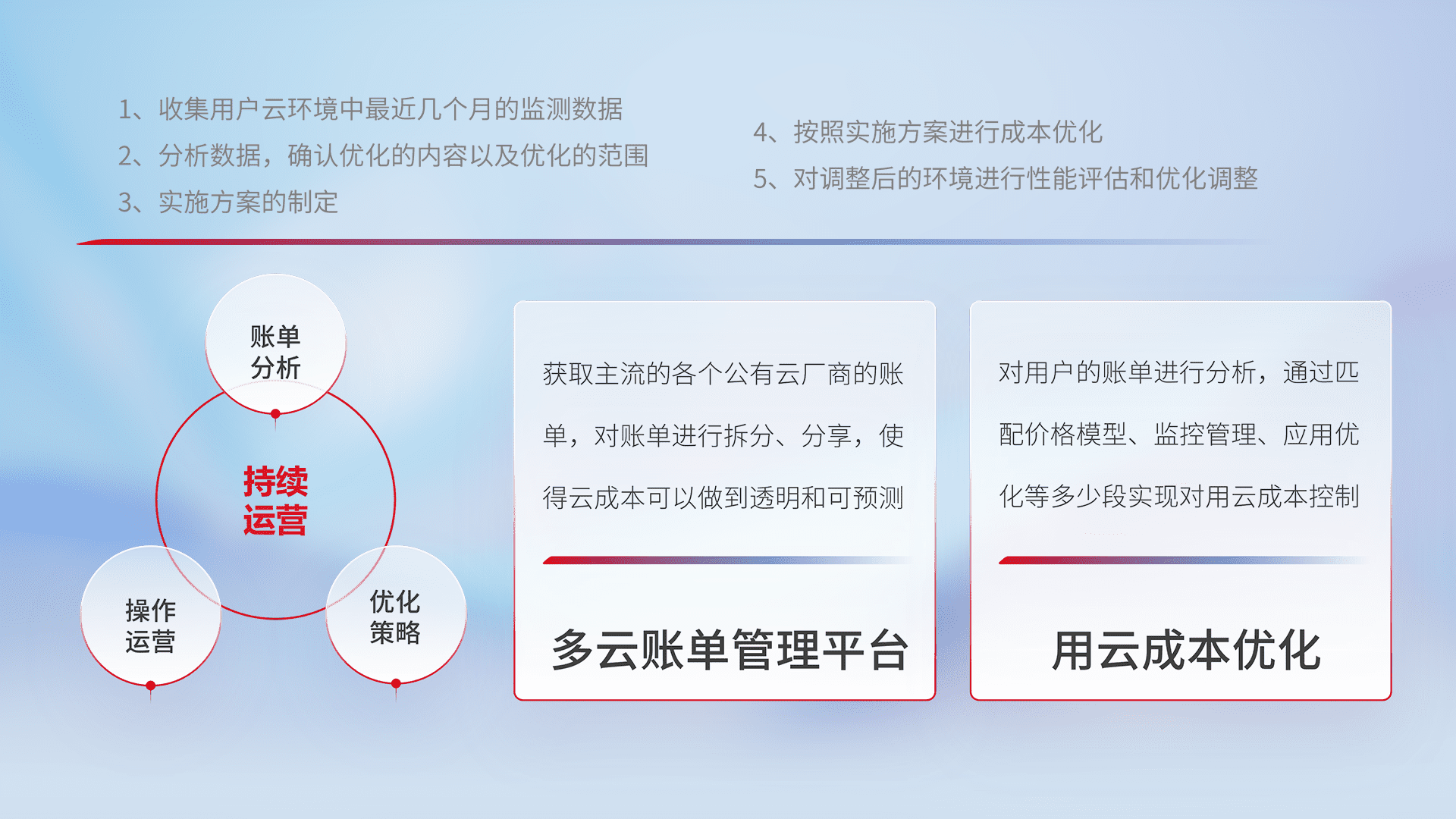 通过多云纳管,,以统一的资源数据模型把客户的云资源进行抽象和封装,,,,进而实现对多云资源的统一操作,,,保障云资源管理的可靠性、、、稳定性与可用性。。。。量身定制化运维内容,,,配置、、开发运维、、补丁管理、、、备份、、、监控、、、认证和访问管理、、、、审计和日常巡检等,,,保障在用云过程中的可靠度,,,稳定度以及高可用率。。。
